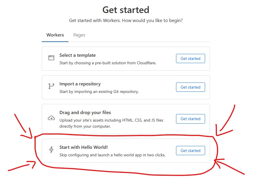 🔹 در بخش Workers روی گزینه Start with Hello World! کلیک کنید.