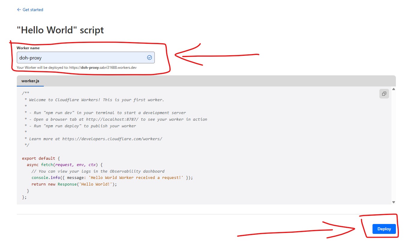 🔹 نام Worker را به دلخواه انتخاب کنید (مثلاً doh-proxy) و روی deploy کلیک کنید.