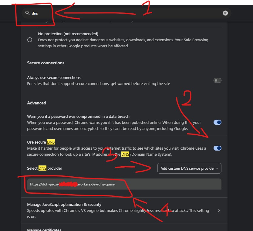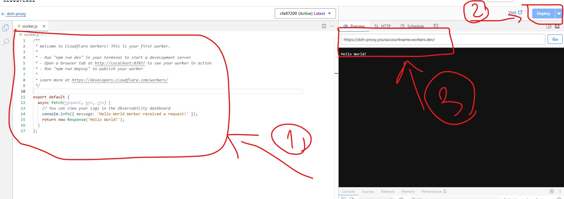 3.سپس آدرس Worker شما  یا همان DoH Proxy خود را کپی کنید که روی عکس فوق با شماره 3 نشان داده ام.